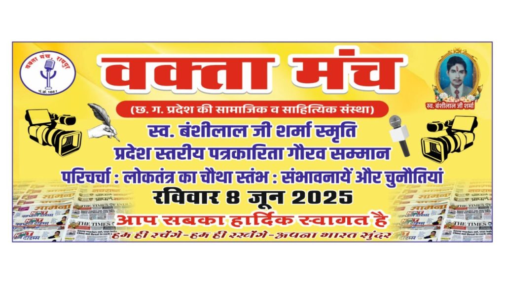 रायपुर l प्रदेश की प्रतिष्ठित सामाजिक व साहित्यिक संस्था वक्ता मंच द्वारा रविवार 8 जून को संध्या...