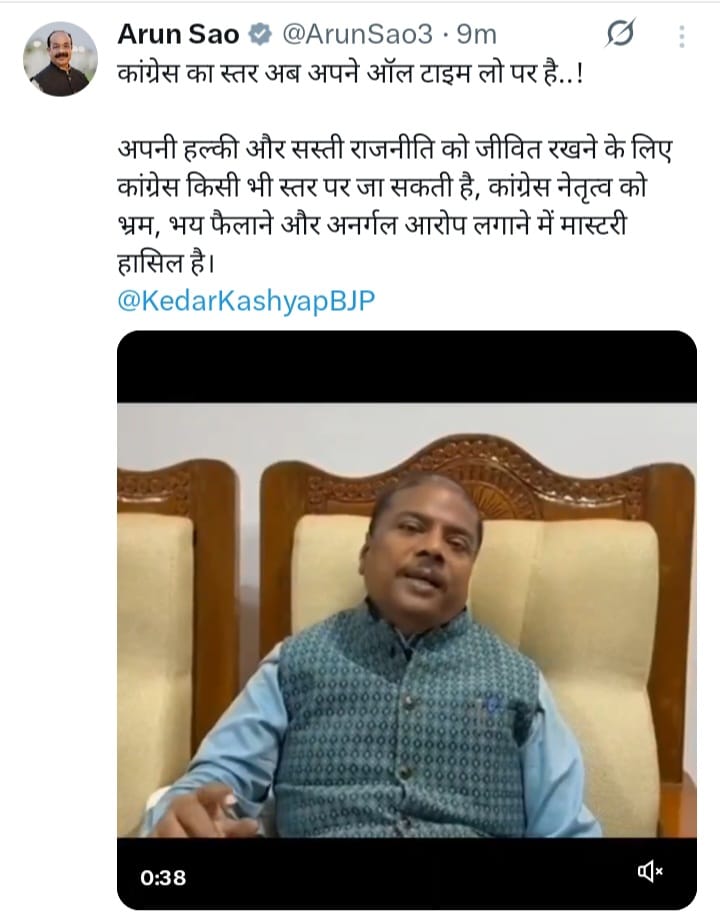 डिप्टी सीएम साव ने केदार कश्यप का वीडियो पोस्ट कर लिखा, कांग्रेस ने स्तरहीनता की सारी हदें...