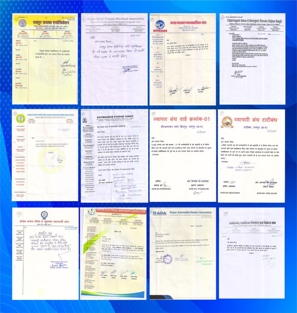 Raipur: जय व्यापार पैनल से श्री जितेन्द्र दोशी एवं श्री विक्रम सिंहदेव ने बताया कि व्यापारिक संगठनों में जय व्यापार पैनल की कार्यशैली और व्यापारी हित में किए गए प्रयासों को देखते हुए शहर की 21 और एसोसिएशनों ने अपना समर्थन व्यक्त किया है। इसके साथ ही अब तक कुल 42 व्यापारी संघों ने जय व्यापार पैनल पर अपना विश्वास जताया है।