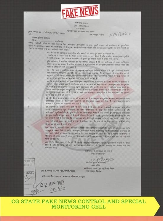 छत्तीसगढ़ में एक फर्जी लेटर सोशल मीडिया पर तेजी से वायरल हो रहा है। इस लेटर को छत्तीसगढ़ शासन के गृह विभाग की ओर जारी होना बताया गया है। इतना ही नहीं इसमें अवर सचिव मनोज कुमार श्रीवास्तव के नाम का फर्जी हस्ताक्षर भी है। मामले की जानकारी गृह सचिव मिलने पर अवर सचिव मनोज कुमार श्रीवास्तव ने नवा रायपुर के राखी थाने में एफआईआर दर्ज कराई है।