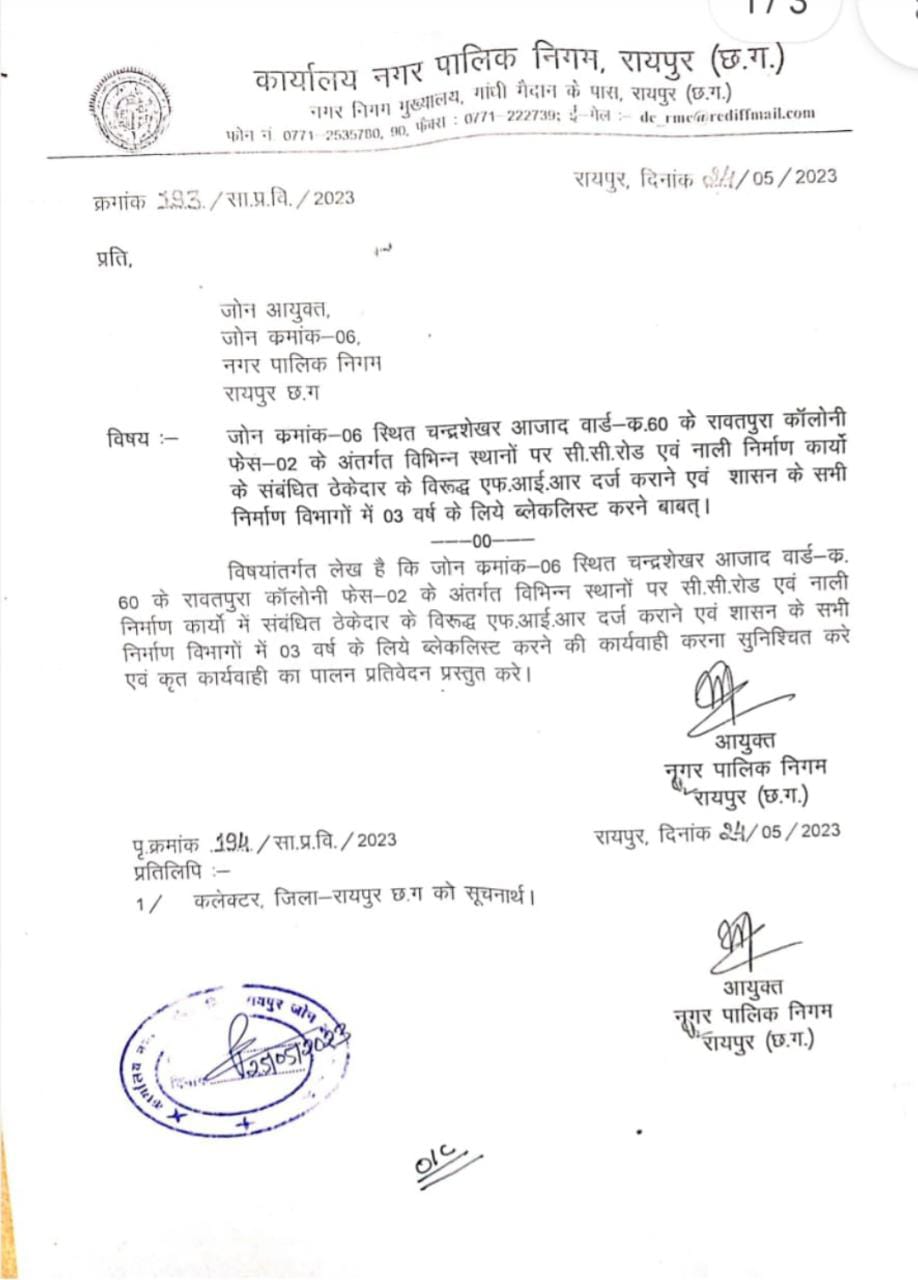 रायपुर .नगर निगम आयुक्त ने एक ठेकेदार पर FIR करने का आदेश दे दिया, मगर पुलिस ने इस मामले में कोई कार्रवाई नहीं की। आदेश के 3 दिन बीत जाने के बावजूद अब तक इस आदेश का पालन नहीं किया गया। ठेकेदार पर किसी भी तरह की कोई कार्रवाई नहीं हुई है । आदेश निगम आयुक्त IAS अधिकारी मयंक चतुर्वेदी ने जारी किया था।