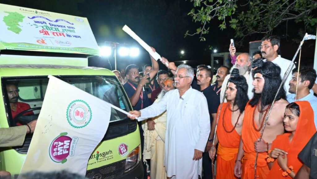 मुख्यमंत्री श्री भूपेश बघेल ने आज रायपुर स्थित अपने निवास परिसर से निजी एफएम रेडियो चैनल की पहल ‘राम पथ से राम वन‘ का शुभारंभ किया और इसमें शामिल दो वाहनों को सुकमा जिले के रामाराम और कोरिया जिले के सीतामढ़ी-हरचौका के लिए हरी झंडी दिखाकर रवाना किया। ‘राम पथ से राम वन‘ के माध्यम से भगवान राम की छत्तीसगढ़ यात्रा में शामिल प्रमुख स्थानों की मिट्टी एकत्रित कर इसके अंतिम पड़ाव माता कौशल्या धाम चंदखुरी में वृक्षारोपण किया जाएगा। साथ ही इस यात्रा के दौरान एफएम चैनल द्वारा भगवान श्रीराम की छत्तीसगढ़ यात्रा से जुड़ी कहानियों और मान्यताओं को भी आमजनों के साथ साझा किया जाएगा।