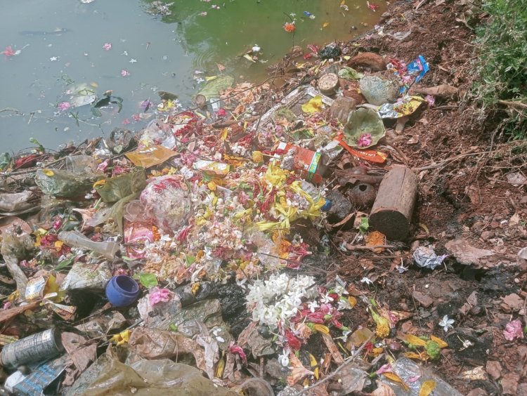 शास्त्रों अनुसार कहा जाता है कि रुके हुए जल में किसी धार्मिक चीजों का विसर्जन नहीं किया जाता। मगर कोंडागांव के राम मंदिर तालाब में आप देख सकते हो रोज पूजा करने वालों के ही द्वारा घर पर रखे हुए हफ्ते भर से ज्यादा के चढ़े हुए पुष्प व फल को रुके हुए जल में विसर्जन किया जा रहा है, जिसे किसी नदी में विसर्जन करना होता है,जिसके चलते तालाब पूरी तरह से दूषित हो चुका है। आप फ़ोटो व वीडियो के माध्यम से देख सकते हो कि दूषित जल की वजह से किस तरह जल में रहने वाली जीव किस तरह तड़प के मरी इसका अंदाजा लगाया जा सकता हैं ।