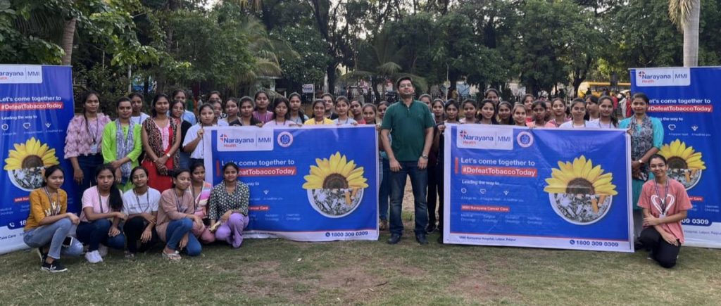 रैली में एमएमआई नर्सिंग कॉलेज से स्टूडेंट्स और पार्क में मौजूद अन्य लोगो द्वारा हिस्सा लिया। कार्यक्रम में डॉ. भारत भूषण सर्जिकल ऑन्कोलॉजिस्ट, डॉ यश चड्ढा – हेड एन नैक ओंको सर्जन एवं नर्सिंग स्टूडेंट्स ने आम जनता से तंबाकू के इस्तेमाल से होने वाले दुष्प्रभाव की जानकारी दी और इसके सेवन को बंद करने की अपील की रायपुर, दुनिया में हर वर्ष 31 मई को विश्व तंबाकू निषेध दिवस मनाया जाता। विश्व स्वास्थ्य संगठन ने 1988 में 31 मई को हर साल दुनिया भर में विश्व तंबाकू निषेध दिवस के रूप में मनाने का निर्णय लिया था। उसके बाद हर वर्ष यह दिवस मनाया जा रहा है। तंबाकू एक ऐसी वस्तु है जिससे दुनिया का हर व्यक्ति परिचित है। चाहे कोई तंबाकू का सेवन करता हो या ना करता हो मगर उसके दुष्परिणामों का हर व्यक्ति को ज्ञान है। आज तंबाकू दुनिया के सामने सबसे बड़ी महामारी बनी हुई है। उसके उपरांत भी सबसे अधिक व्यक्ति तंबाकू का सेवन करते हैं। इसी विषय में जागरूकता बढ़ाने के लिए 31 मई 2024, एमएमआई नारायणा हॉस्पिटल लालपुर रायपुर द्वारा तंबाकू के खिलाफ जागरूकता रैली का आयोजन किया। इस आयोजन को अस्पताल द्वारा रायपुर शहर के विभिन्न पार्क में जागरूकता अभियान चलाया गया।