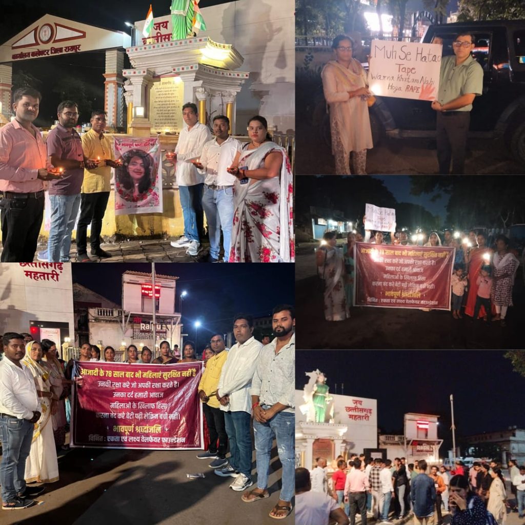 पश्चिम बंगाल में कोलकाता के RGK मेडिकल कॉलेज में एक महिला डॉक्टर के साथ बलात्कार एवं निर्मम हत्या एवं छत्तीसगढ़ के रायगढ़ जिले रक्षाबंधन के दिन 8 लोगों ने आदिवासी युवती के साथ सामूहिक दुष्कर्म की वारदात को अंजाम दिया था। महाराष्ट्र के ठाणे जिले के बदलापुर में एक और हैवानियत की घटना हुई जिसमें 4 साल की 2 मासूम बच्चियों के निजी स्कूल में यौन शोषण की घटना सामने आने के बाद मानवता को शर्म सार कर दिया है,लोगो का गुस्सा फुटा जा रहा हैं इस जघन्य अपराध के विरोध में एकता फाउन्डेशन एवं लक्ष्य वेलफेयर फाउन्डेशन के संयुक्त तत्वाधान में मौन पथ संचलन रैली व दीप मार्च निकाला गया।मौन पथ संचलन रैली पंडरी पुराना बस स्टैंड से प्रारंभ होकर कलेक्ट्रेट परिसर छत्तीसगढ महतारी के पास दीप प्रज्ज्वलित कर मृतका की आत्मा की शांति के लिए दो मिनट का मौन धारण किए शशांत जी ने कहा ने कहा कि प्रत्येक व्यक्ति को जागरूक होने की जरूरत है। संजीव जी ने कहा की महिलाओं से अपने अधिकार को समझने व जागरूक होकर लड़ने के लिए प्रेरित किया।के इस मौके में एकता फाउन्डेशन के संस्थापक वा संचालक शशांत साहू जी श्रीमती विद्या साहू सचिव, संजीव यादव संस्थापक/संचालक लक्ष्य वेलफेयर फाउन्डेशन, महासचिव श्रीमती ऋतु वर्मा जी, छाया पार्षद ऋषि साहू जी, समाज सेवक निमिष साहू जी,श्रीमति मीना साहू जी,भारती साहू जी,अनिता साहू जी,मनीषा कोंडे जी,निम्मी मानिकपुरी जी,सोनम साहू जी पर्ल शाइन पब्लिक स्कूल की प्राचार्य श्रीमती आशा पटले जी, श्री गजेंद्र पटले जी, श्रीमती इंद्रा गबेल जी,श्रीमती प्रियंका गबेल जी,समाज सेवक कपिल गोस्वामी जी, श्रीमती ऋषि गोस्वामीजी,श्रीमती रजनी साहू जी,श्री बंटी कोशले जी,श्रीमती शीतल भंडारी जी,श्रीमती गिरजा लहरी जी,साधना साहू शामिल रहें।