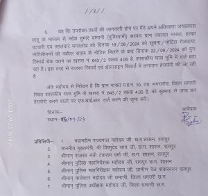 - मगरलोड थाना में लिखित शिकायत के बाद महामहिम राज्यपाल, मुख्यमंत्री, पुलिस महानिदेशक, महानिरीक्षक, कलेक्टर एवम् एसपी धमतरी को लिखा जागरुक व्यक्ति ने कार्यवाही के लिए लिखा पत्र