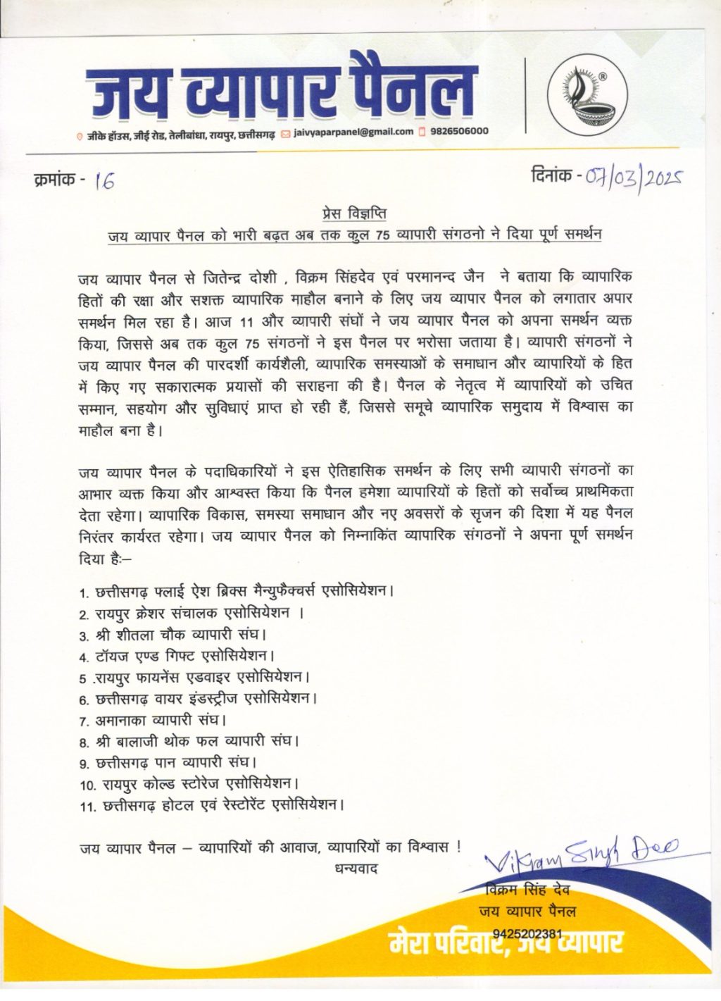 रायपुर. जय व्यापार पैनल से जितेन्द्र दोशी , विक्रम सिंहदेव एवं परमानन्द जैन ने बताया कि व्यापारिक हितों...